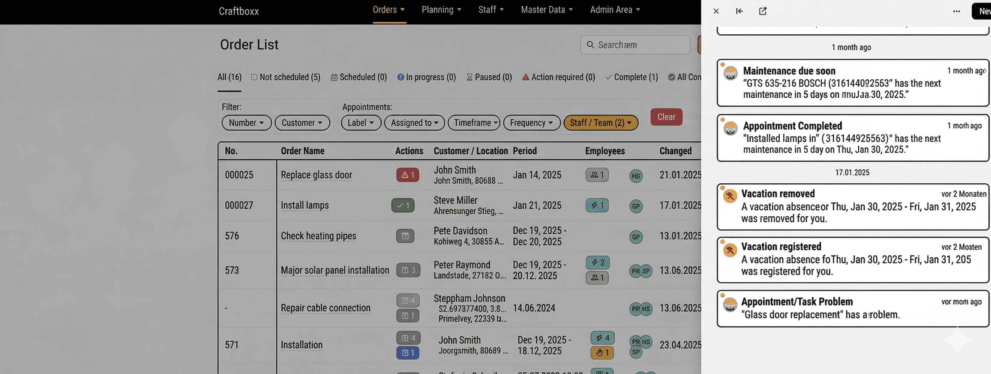 You'll get automatic alerts as soon as a new appointment is created or if an existing one changes. That way, nothing slips through the cracks. An extra change log gives you more info. Thanks to Craftboxx, everyone in the shop can follow every job detail.