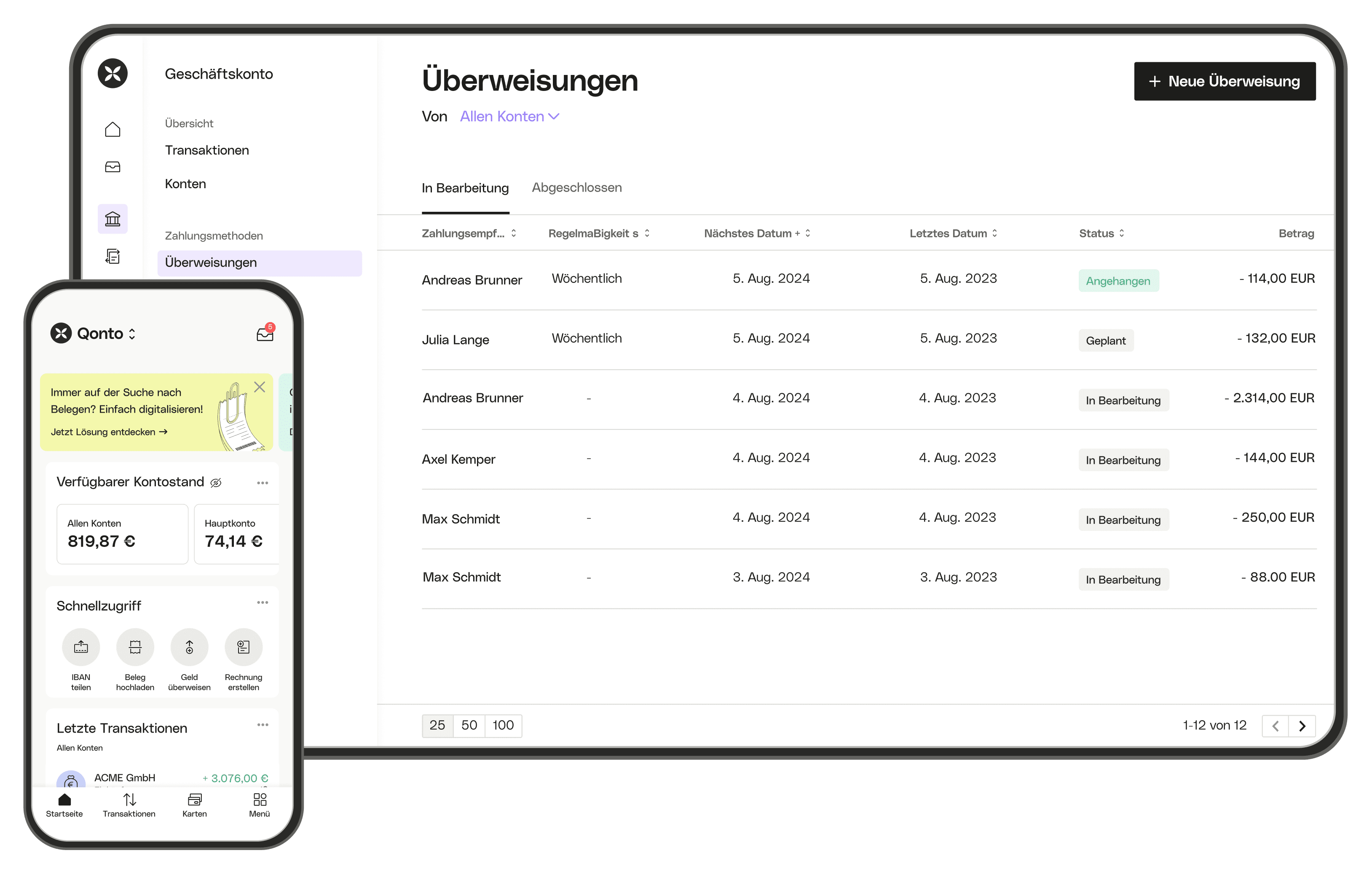 Mit Qonto erledigst du Überweisungen, Lastschriften und Kartenzahlungen komplett online – mit deutscher IBAN, Echtzeit-Überweisungen sowie Apple Pay und Google Pay. So passt dein Banking zu Baustelle, Büro und unterwegs.