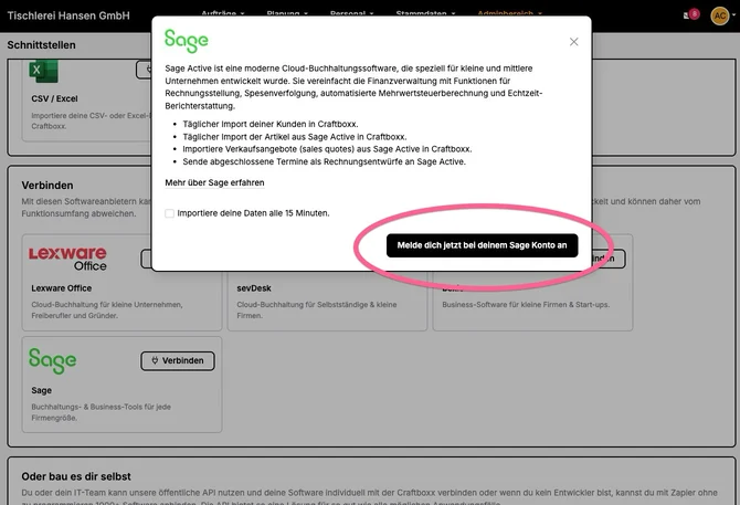 Die Einrichtung ist einfach: Craftboxx Account anlegen und mit Sage Active unter Schnittstellen verbinden. Danach laufen deine Daten automatisch zwischen beiden Systemen.